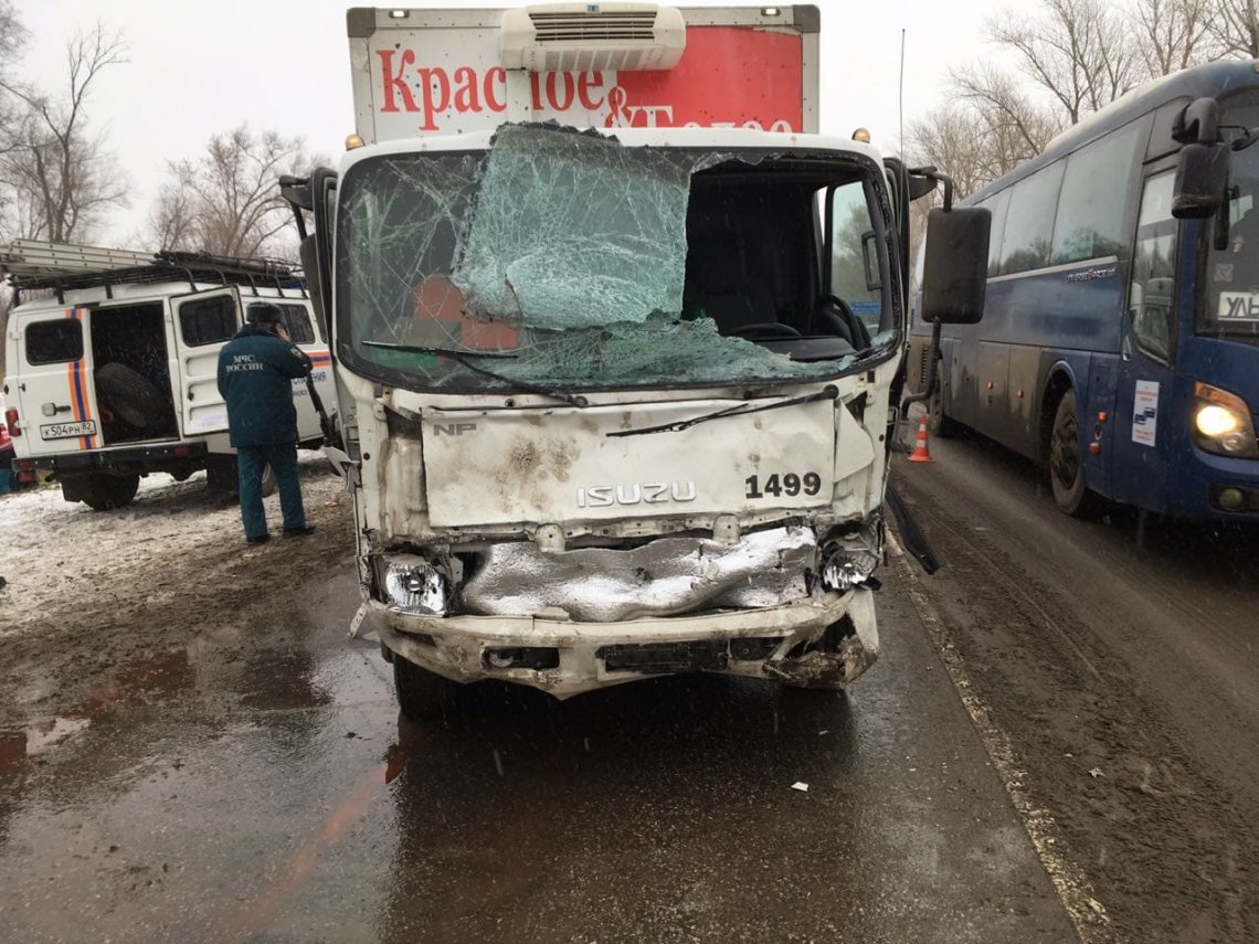 На видео с камеры видно, как легковой автомобиль выходит на обгон, попадает на снежную "кашу" и входит в занос, вылетая на полосу встречного движения. Водитель грузового автомобиля Isuzu пытался принять меры и уйти от столкновения, но расстояние до встречного автомобиля и плохие погодные условия не позволили принять экстренные меры.